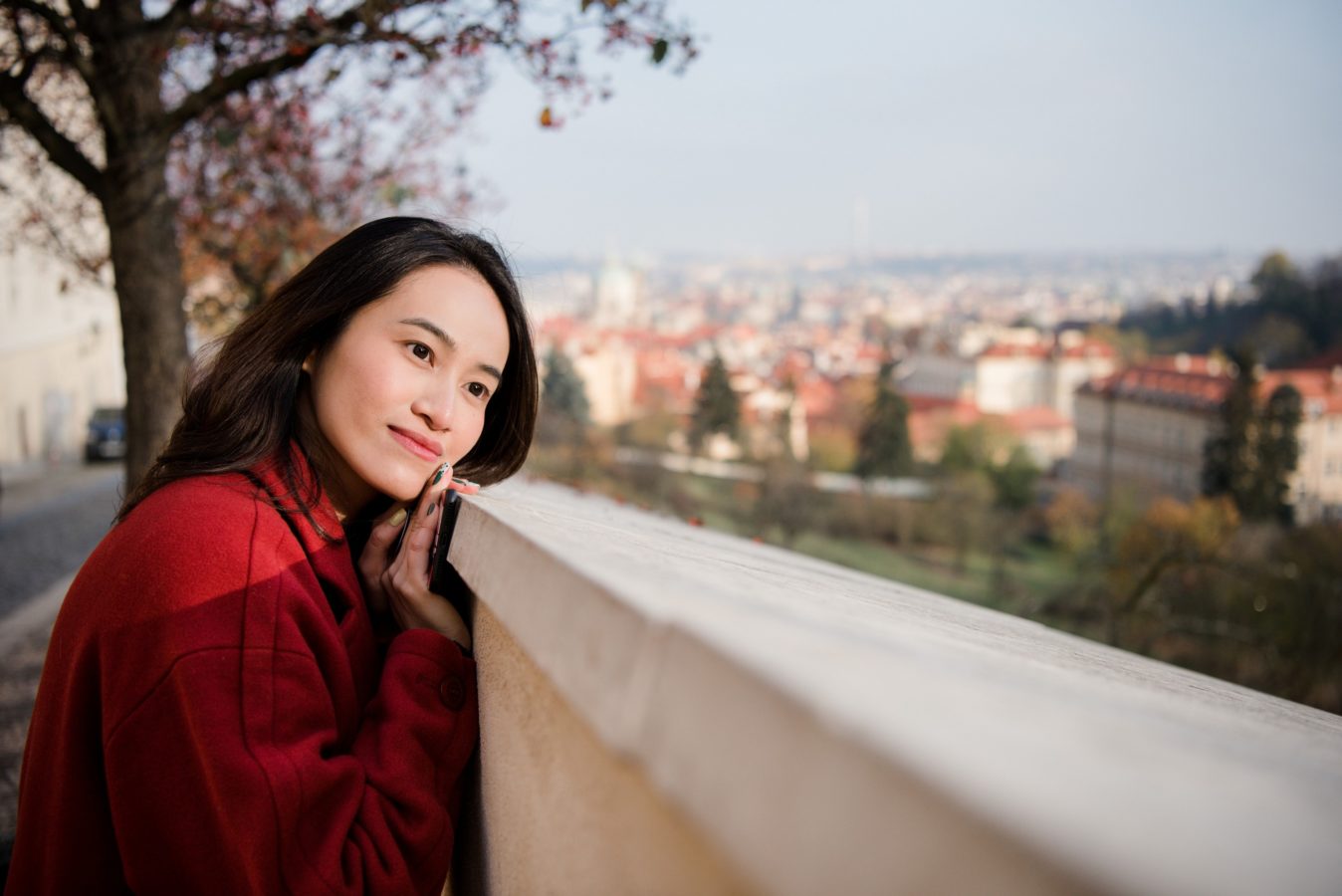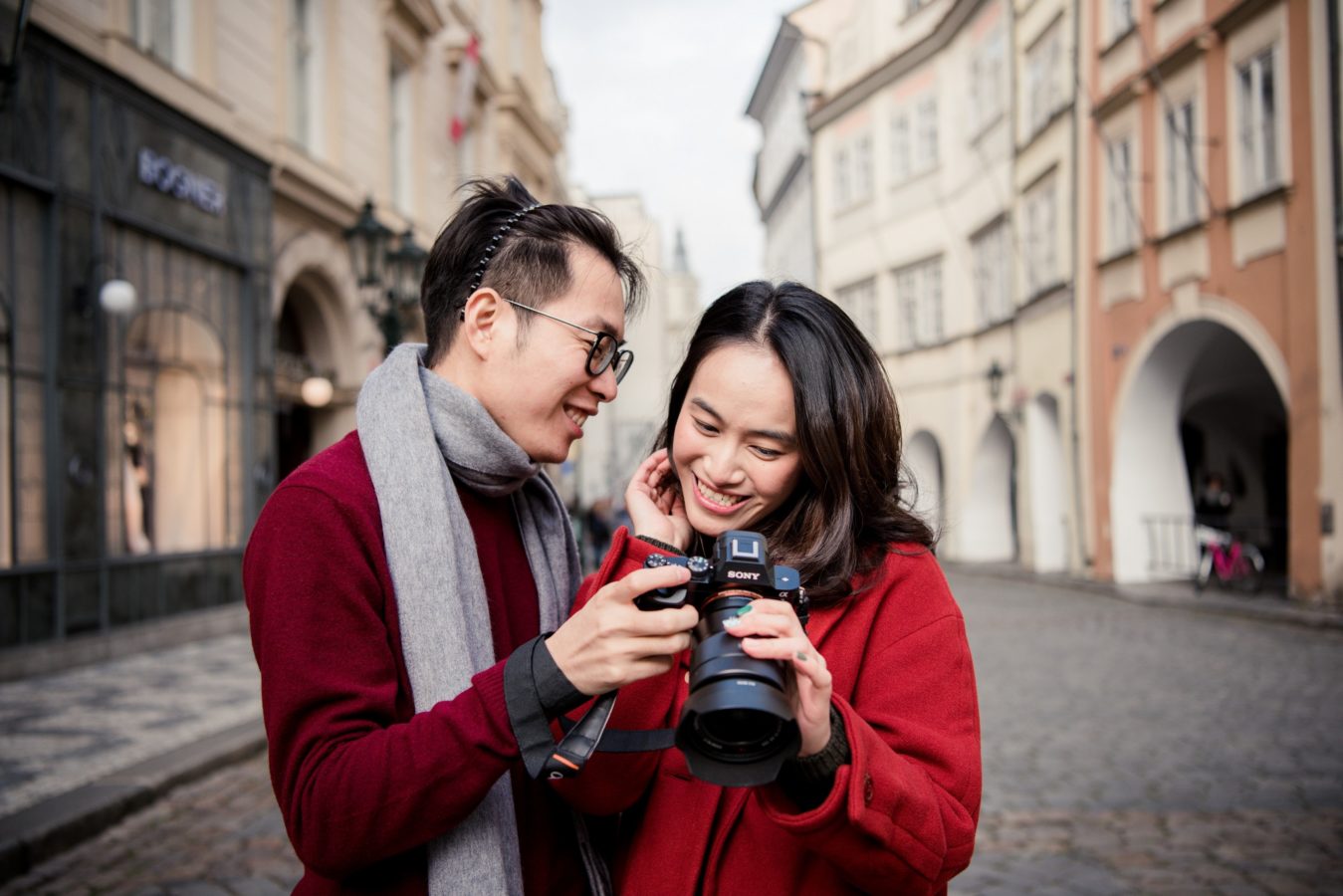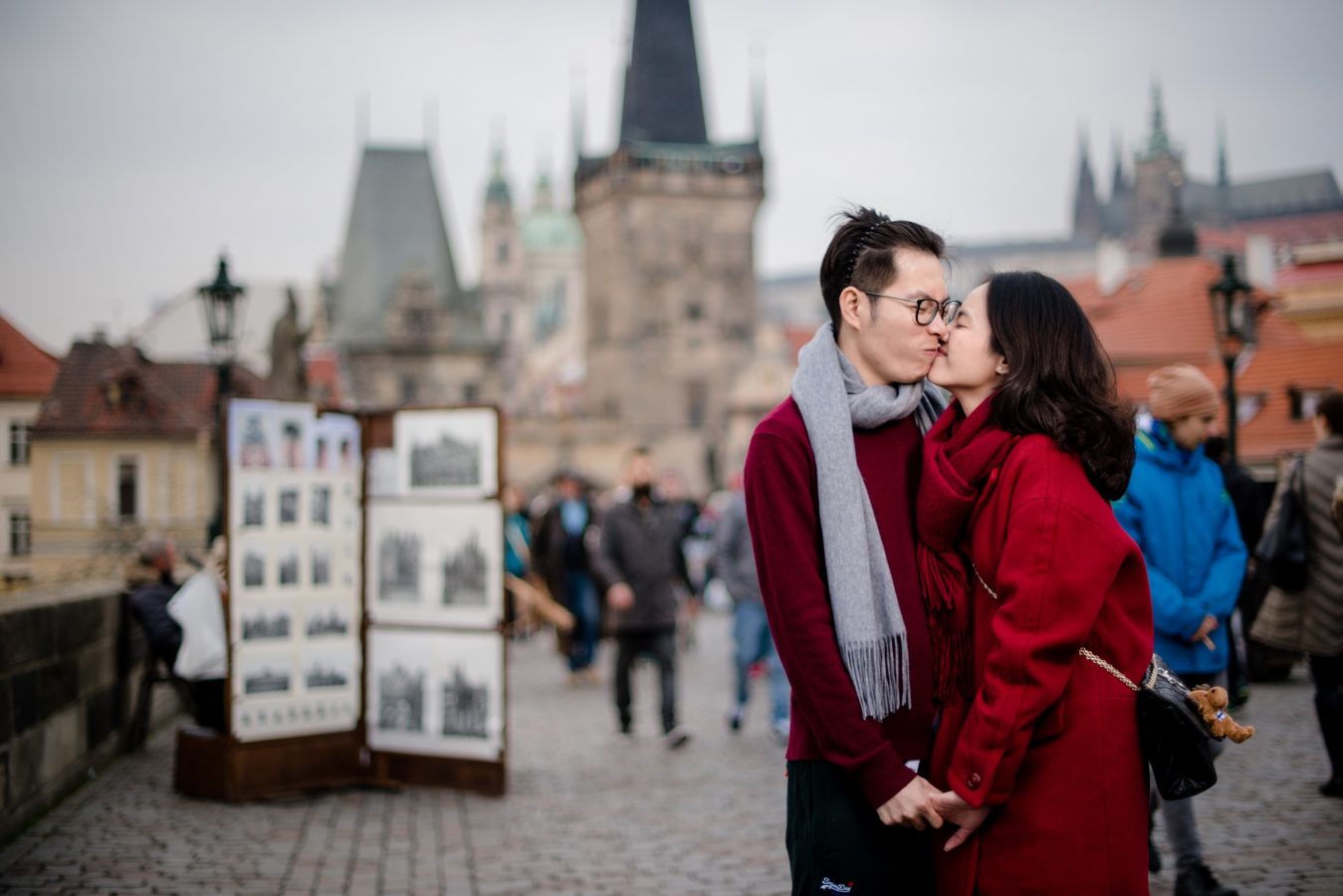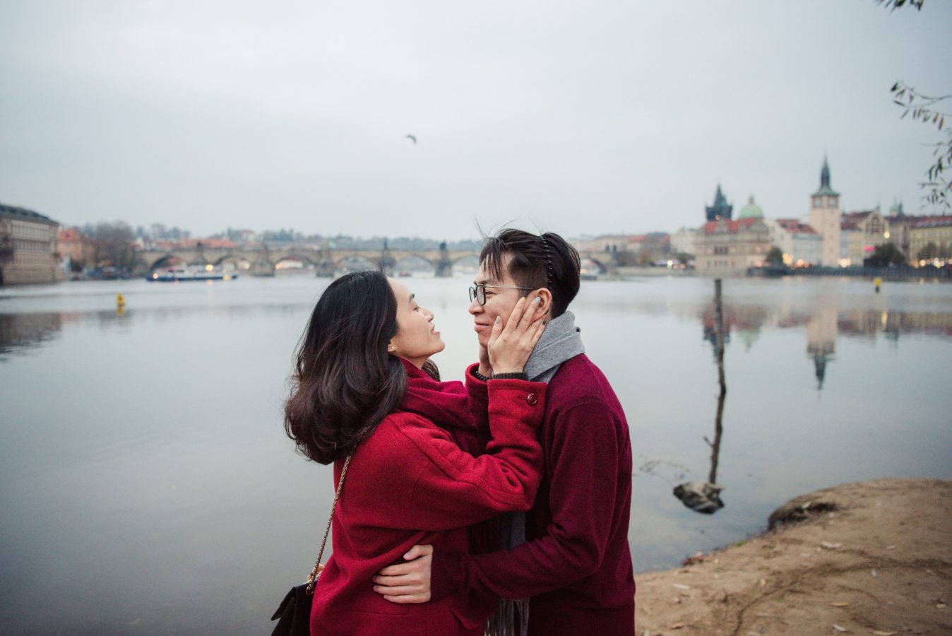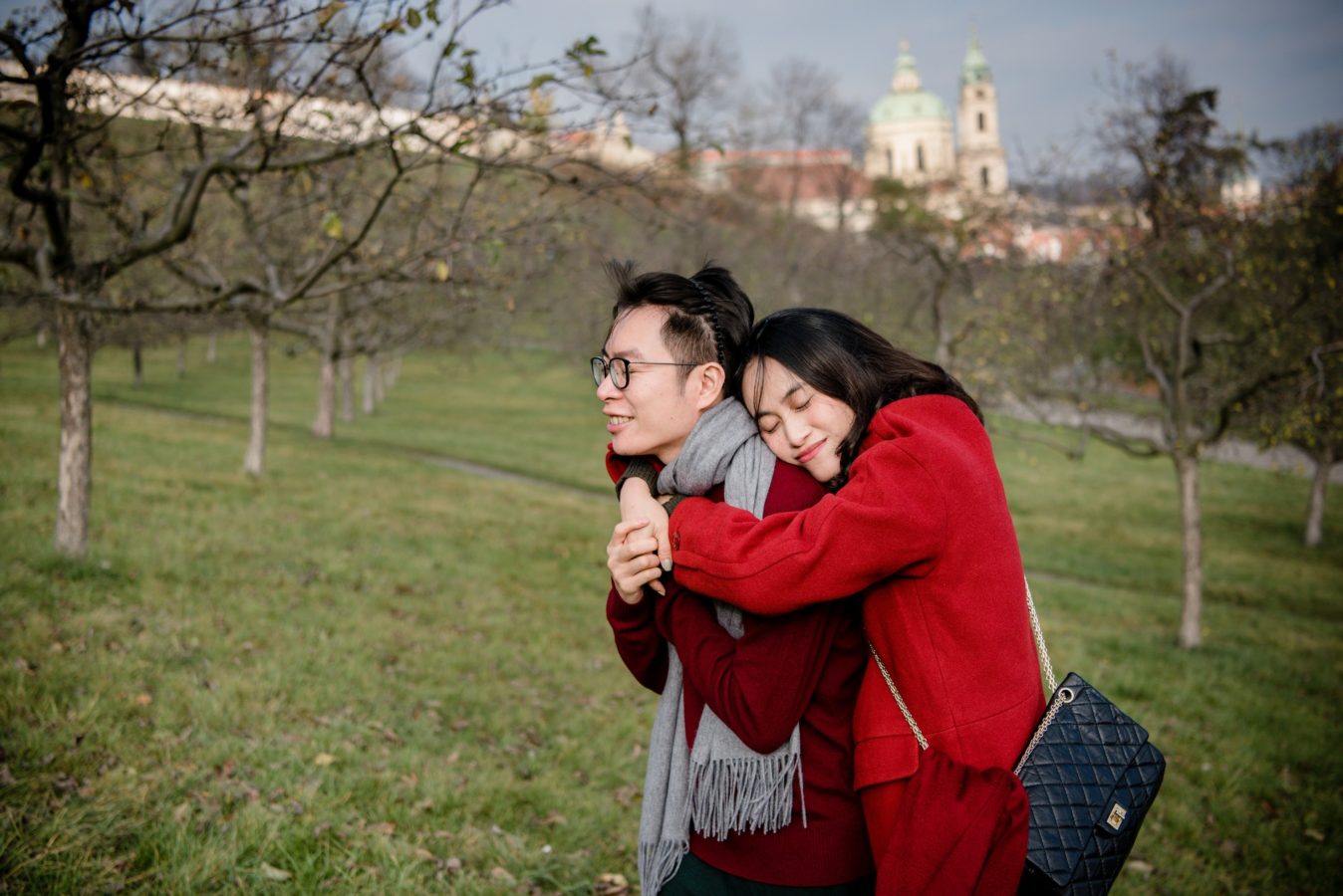 This sweet couple, Eunice and Chris, is from China – and I got the chance to capture the magic of their relationship while sharing a light-hearted and cheerful photoshoot together. The dashing red color of their matching outfits as well with the natural October colors definitely added an atmospheric touch. Together, they were so effortless to photograph while walking the lesser-known streets of Prague with their easy-going nature, dynamic personalities, friendly attitudes and beautiful souls.